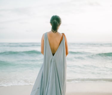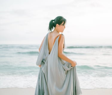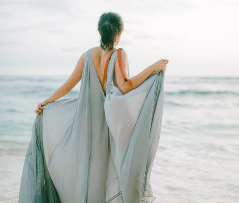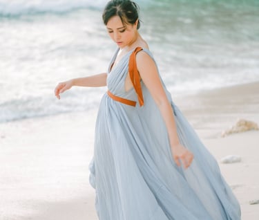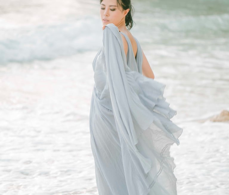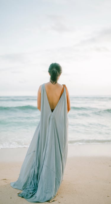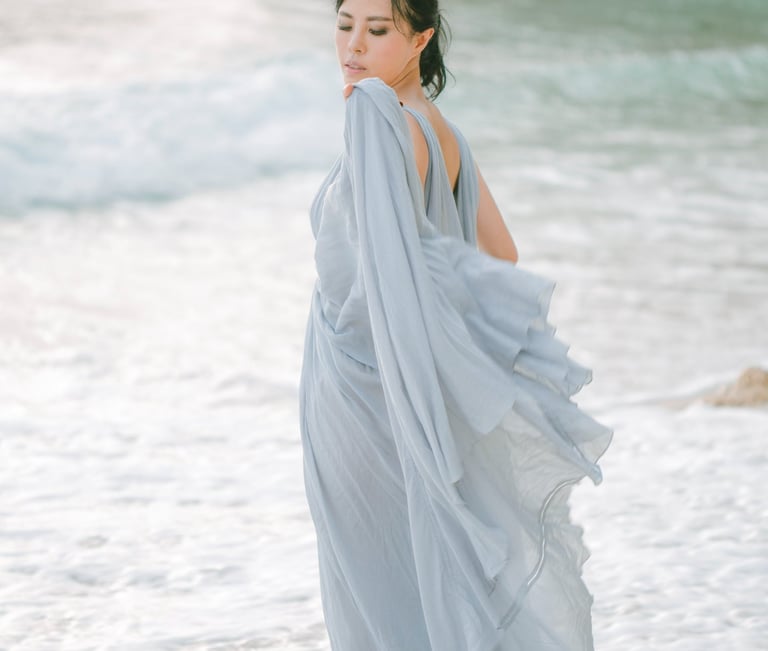The approach was minimal — allowing fabric, gesture, and shifting light to guide the rhythm of the frame. Rather than constructing dramatic moments, the session embraced subtle transitions: a turn of the shoulder, the weight of a step in sand, the way wind shapes a silhouette.